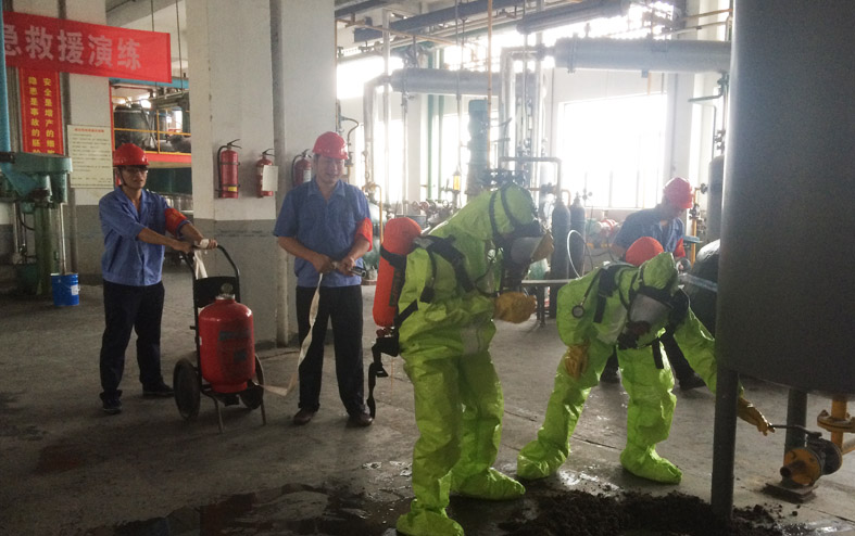 开展行之有效的安全与环保应急救援预案演练:由公司安全环保部牵头,公司全体安委会成员和部分制造部员工在制造部低温工段组织了《因发生溶剂泄漏,导致人员中毒、排水系统受到污染》的应急救援预案活动,极大地提高员工对生产过程中突发情况的应急防护、抢险和救援能力。